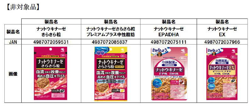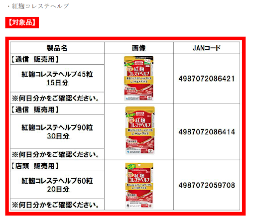 At this point in time, we have not been able to identify the exact ingredient nor have we been able to clearly identify the causal relationship between this product and experiencing kidney problems. However, as a precautionary measure to prevent the spread of health hazards to our customers, we have decided to voluntarily recall the「Beni-koji」related products listed below as Subject Products.