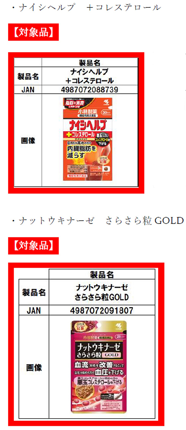 For customers who have any of the Subject Products listed, we ask that you please discontinue the use of the product and refrain from consuming it in the future. In addition, for customers who have consumed the Subject Products and feel any physical discomfort, please contact us. (KOBAYASHI is not selling these products in Thailand.)